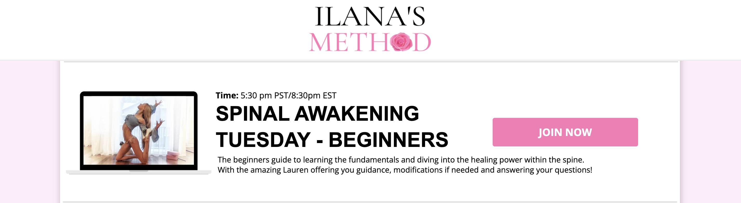 After you have completed the 2 fundamental videos on our website join our “Spinal Awakening” Beginners class Tuesday evening 5:30pm PST/ 8:30pm EST and then any of our live training.